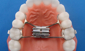 The Nance appliance is used to hold the upper molars in place, to prevent them from rotating or shifting forward. With this appliance, two metal bands are cemented around the first molars and a wire connects the back molars to an acrylic pad, located behind the two front teeth.